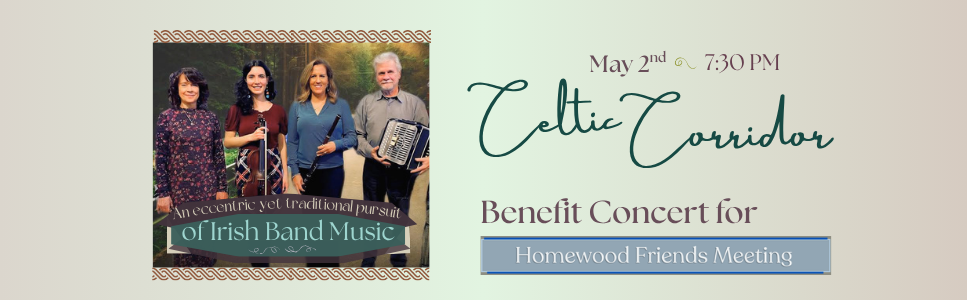 You're invited to see Celtic Corridor on May 2nd! This concert will help raise money to support Homewood Friends Meeting. Your donations are much appreciated to support the Life of our Meeting and our Work in the World. The show starts at 7:30 at the meetinghouse (3107 N. Charles St.)